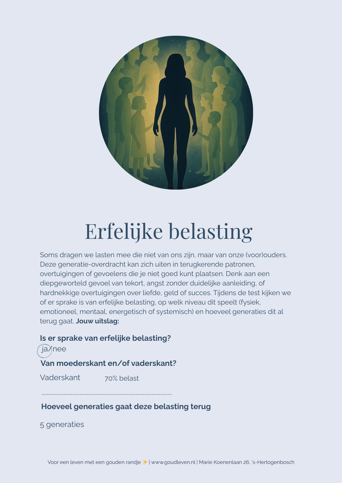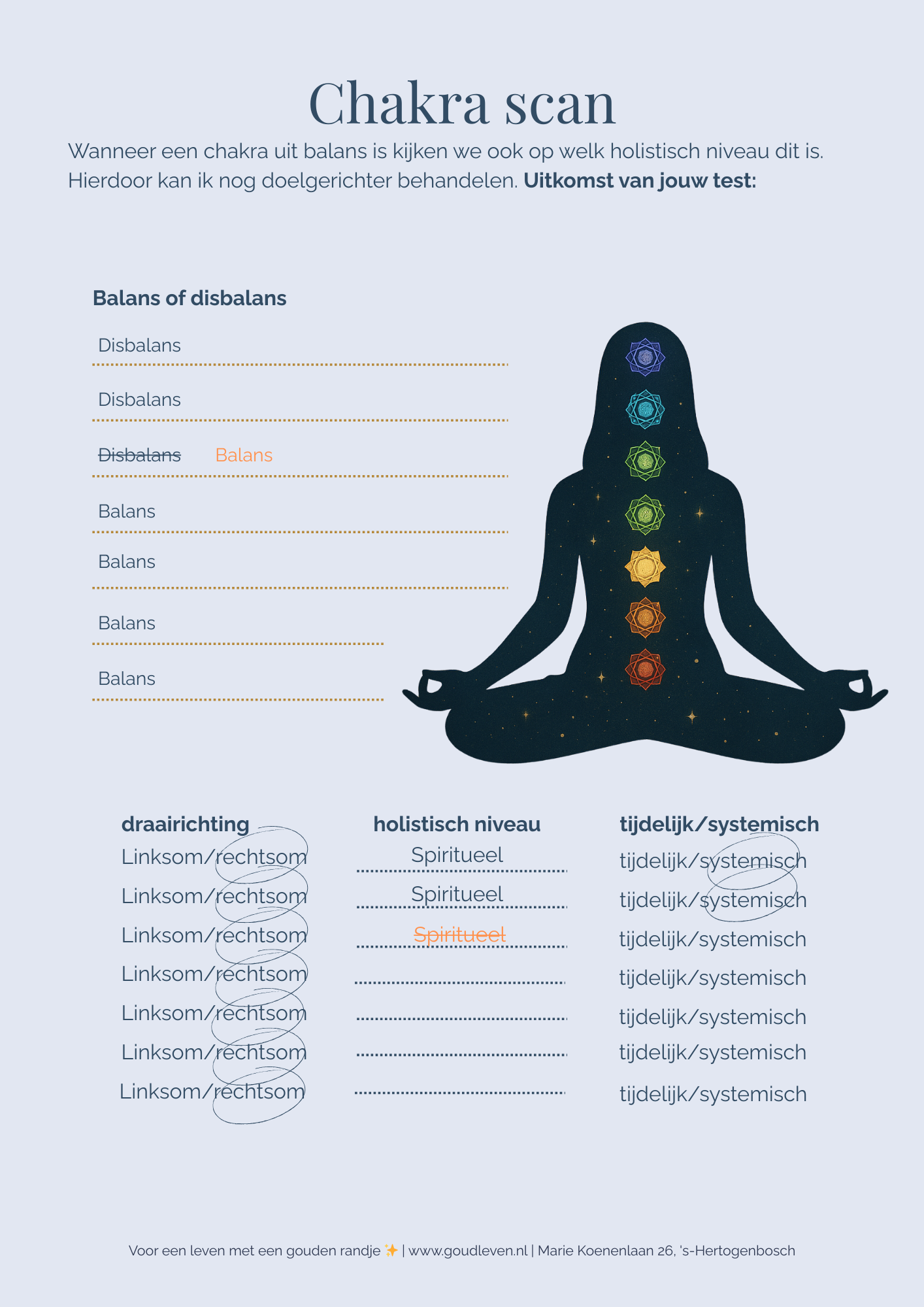 Je ontvangt een uitgebreid verslag in PDF met heldere uitleg in begrijpelijke taal. Hierin staat niet alleen waar er disbalans zit, maar ook jouw sterke punten en een persoonlijk behandeladvies. Zo weet je precies waar de oorzaak ligt en wat jou kan helpen om weer in balans te komen.